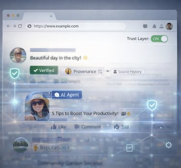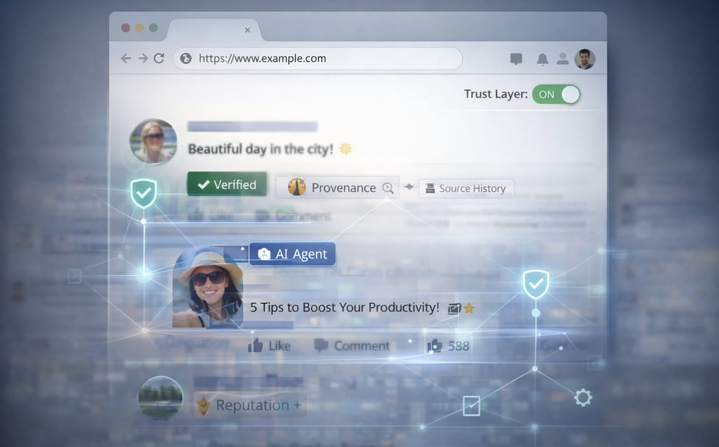 A portable trust layer above the webpage, capable of immediately flagging a viral AI impersonation scam or deepfake election clip across sites.