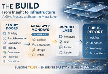 A structured civic build cycle beginning with seven consecutive daily labs – seven entry doors, each complete in itself, where you only need to attend one to meaningfully participate – followed by weekly Meta-Layer Mondays at 11:30a PST for four weeks, and then monthly Meta-Layer Mondays at 11:30a PST through a 12-month arc culminating in a public report-back.